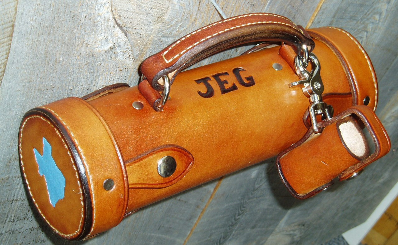Handmade Leather Shuffleboard Weight Case-Made from heavy skirting leather, formed into a perfect cylinder with caps on both ends,divider in the middle, and a heavy duty handle. Approx 10.5 inches long outside-inside compartments are approx 5 inches deep and 2.5 inches in diameter. Includes detatchable coin holder, owners initials if desired, and colored (red/blue) emblems on each end. Emblems can be a state outline as shown or other emblems,stars, circles, letters, numbers etc. These are made to order , so allow 2-3 weeks for delivery.